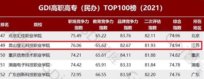 4月21日,GDI智库发布“GDI高职高专(民办)TOP100榜(2021)”,beat365在该榜中位居全国高职高专(民办)中位居49位,江苏省第2位!