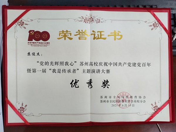 此次演讲比赛是由中共苏州市委宣传部、苏州市教育局主办,苏州市全民国防教育协会、苏州市全民国防教育协会高校分会在苏州大学独墅湖校区承办。本次比赛要求各高校参赛学生以个人、家庭或同学的亲身经历为素材,用自己的所见所闻、所历所悟,抒发对中国共产党的真实情感,为党的百年华诞送上最真诚的祝福。
