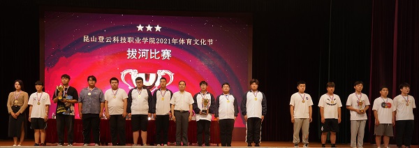钱勤元书记(右九)为拔河赛项获奖者颁奖