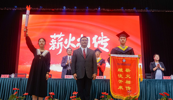 随后,在王振州常务副校长的见证下,毕业生代表胡国成与2020级新生杨南完成薪火相传仪式。