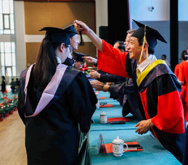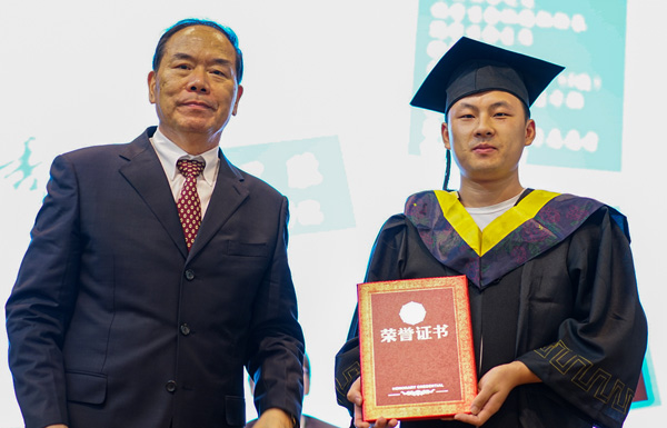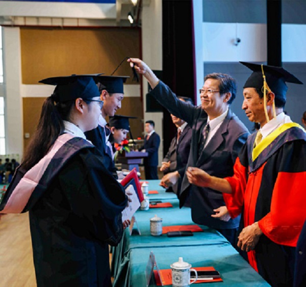 李先立、郑家泰和全体校领导为优秀毕业生颁发获奖证书、毕业证书并拨穗。