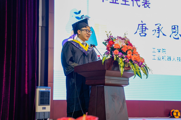 2018级工业机器人技术专业的唐承恩同学代表全体毕业生发表感言,他告诫学弟学妹们,不要用战术上的勤奋来掩盖战略上的懒惰,要找到属于自己的方向,努力拼搏、不留遗憾。