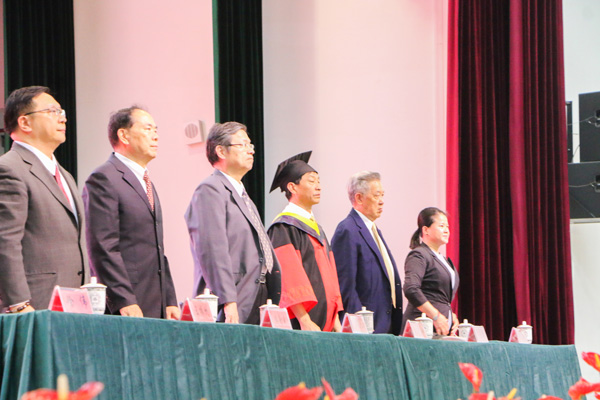 郑家泰荣誉校长宣读董事长林赐农对毕业生的寄语:“在你们即将跨入社会之际,我想以“成人、成就和成功”人生必经和努力的三个关键分享一些看法。