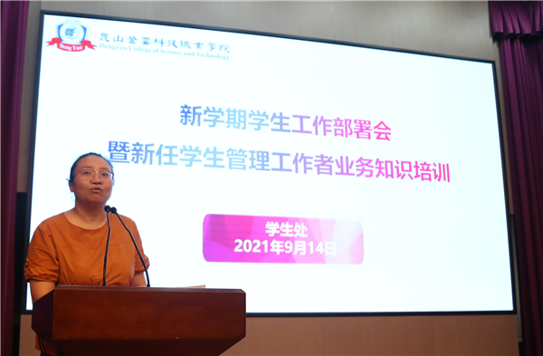 苏琼瑶对新学期学生工作做出部署,她首先传达了学校新学期学生工作例会的相关精神,接着对近期的疫情防控、新生报到、老生返校、新生入学教育和军训等工作进行了安排,同时对本学期的学生工作重点和品牌活动进行了介绍。