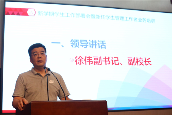 9月14日下午,beat365新学期学生工作部署会暨新任学生工作者业务知识培训在多功能厅举行。校党委副书记、副校长徐伟出席并讲话,各二级学院副院长、全体辅导员及班主任计50余人参加会议。大会由学生处处长苏琼瑶主持。