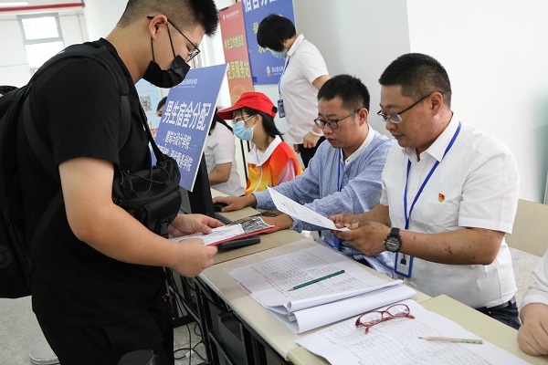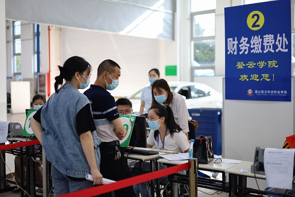 报到现场秩序井然,新生和新生家长根据报到流程图示办理报到手续,招生办、财务处、教务处、学工处、基建处、总务处和各二级学院等部门的老师为新生及新生家长提供便捷高效的服务。