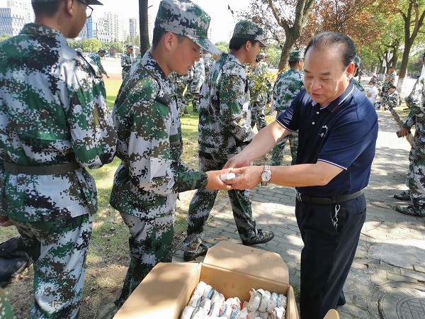 刘言强等为新生和军训教官赠送了中秋特色月饼。
