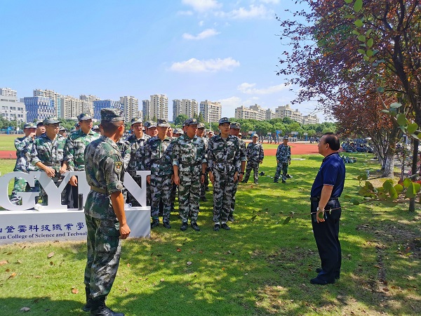 9月21日,中秋佳节,秋高气爽。工学院院长刘言强带领副院长金春凤、何玉勤、院长助理王小雷等赴体育运动场看望慰问正在军训的工学院新生。