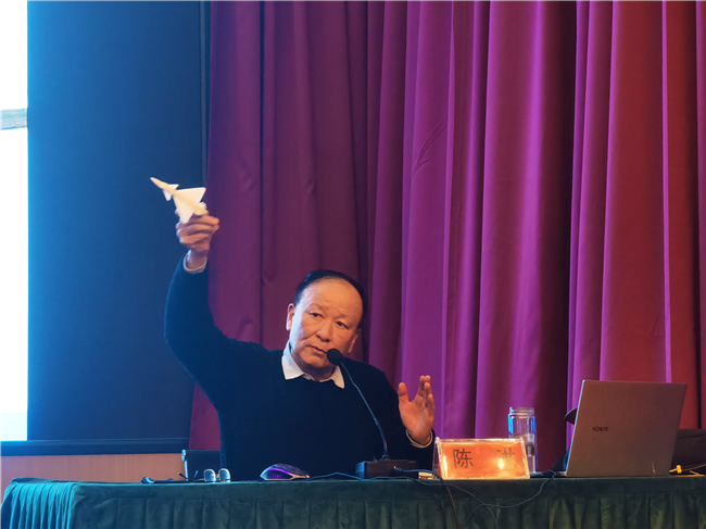 他手拿飞机模型在空中比划,用直观可见的方式和通俗易懂的语言,向同学们分享军事知识,并勉励同学们用自己的努力和勤奋去实现人生理想。讲座最后,陈洪教授与同学们进行互动,与会师生争先向教授提问交流,现场气氛活跃,参会人员感受颇深,许多同学向陈洪教授表示感激,并与陈洪教授合影。