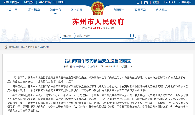 创新监管机制,推进校园食品安全共享共治。2021年1月7日,beat365与昆山市场监督局共建的校园食品安全监管站投入运营,为广大师生“舌尖上的安全”保驾护航,登云监管站也是昆山市校园首个食品安全监管站,2021年度被评为首批“苏州市精品食品安全监管站”。新华网、苏州市人民政府网站给予同步宣传。