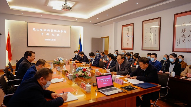孙勇部长代表昆山市委市政府对省委教育工委的决定表示完全赞成和坚决拥护,对钱书记任职期间学校所取得的成绩表示高度赞赏,并对学校的发展提出三点建议:一是希望学校在推动产教融合上展现新担当,为昆山大力发展新产业,储备新动能。二是希望学校在构建多元合作上构建新格局,拓宽合作领域,跑出登云特色、昆山魅力的共赢发展新赛道。三是希望学校在培养培育大国工匠上彰显新功力,要进一步提升政治站位,始终牢记以立德树人为根本任务,继续保持优良的教风学风,脚踏实地,锐意进取,为区域经济发展提供源源不断的高层次技术技能人才支撑。昆山市将不折不扣的贯彻落实上级组织安排,全力支持登云学院,以目标点亮前行之路,以使命激扬奋进之帆,共同以实际行动迎接党的二十大胜利召开。