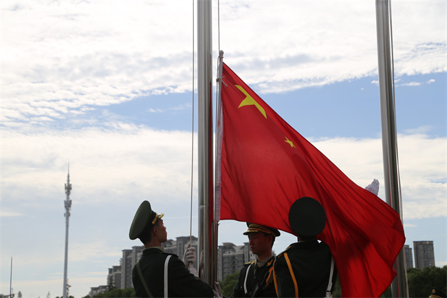 上午9时,伴随着庄严的国歌声,典礼拉开序幕,五星红旗冉冉升起,全体师生起立,奏唱国歌。