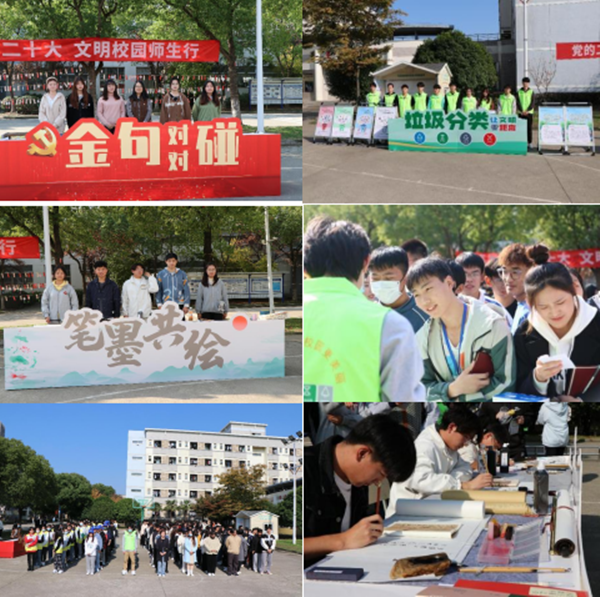 启动仪式结束后,宣传教育活动和文化月活动正式开始。本次活动以“笔墨共绘二十大,文明校园师生行”为主题,活动设置党的二十大精神宣传展板区、“金句对对碰”交流区、创意手工区、笔墨共绘区、垃圾分类宣教互动区等五个活动区域。师生通过党的二十大精神进公寓宣传展板进一步学习报告精髓,诵读金句、交流心得;爱好书法的师生用笔墨书写对党和国家的热爱;来自DIY社团的学生利用废旧物品制作工艺品并对师生销售,所得款项将用于资助农民工子弟学校的困难学生,以实际行动带动身边同学践行社会主义核心价值观,发扬奉献精神 ;垃圾分类宣教和互动活动通过知识宣传、互动游戏、打卡积分等形式开展。整场活动在热烈欢乐的氛围下成功举办,师生广泛参与,以别具一格的形式演绎了一场精彩纷呈的贯彻党的二十大精神思政育人活动盛宴。