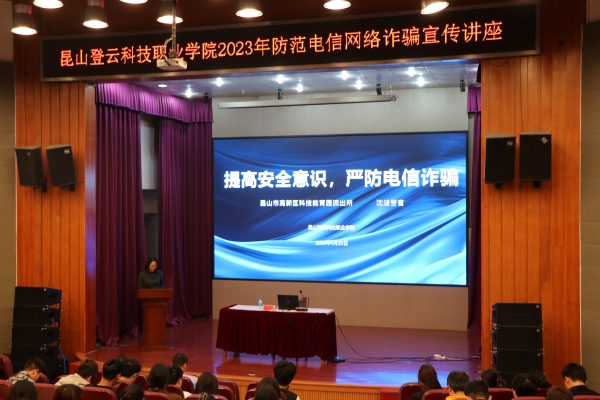 为提高学生的反诈意识,增强学生识别和防范诈骗的能力,减少不必要的财产损失,beat365于4月20日下午,在多功能报告厅开展防诈骗宣传讲座。本次讲座由昆山市高新区科技教育园派出所所长沈波向beat365学生进行普及宣讲,由beat365后勤保卫处副处长刘俊红主持。