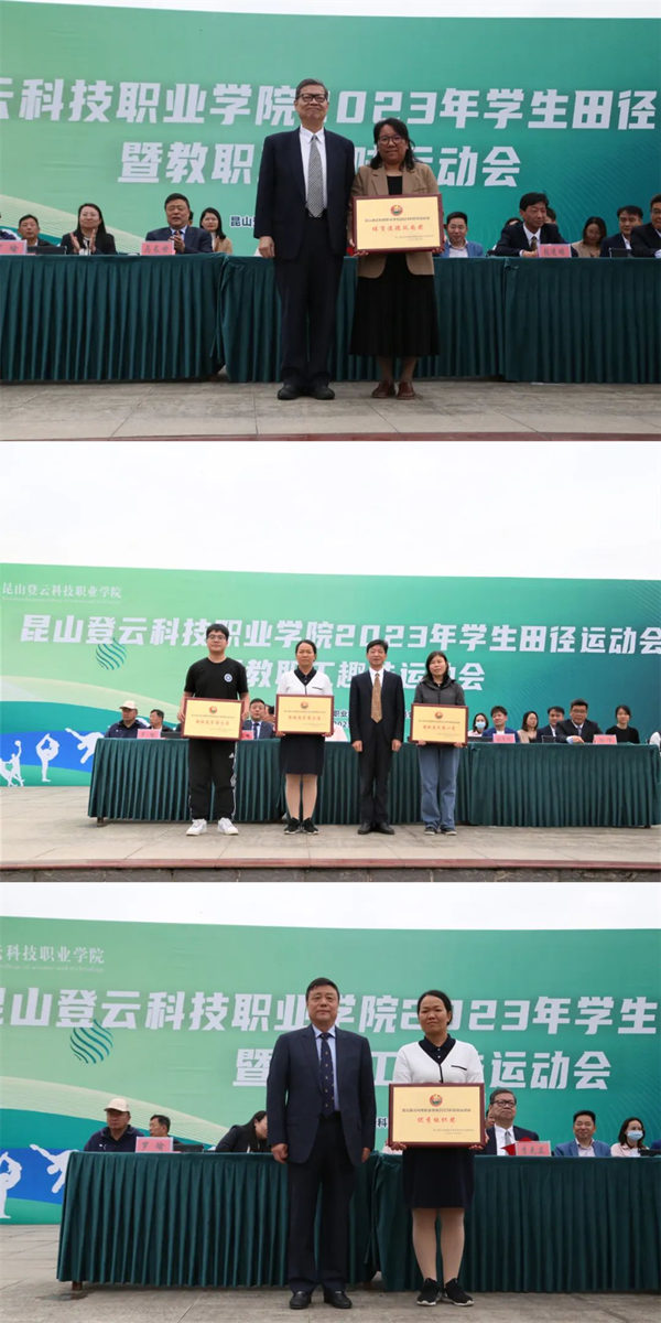 徐伟副校长宣读了本届运动会“优秀组织奖”和“体育道德风尚奖”的表彰决定,建筑与设计学院荣获“优秀组织奖”荣誉称号,现代服务学院荣获“体育道德风尚奖”荣誉称号。随后,学校董事会执行董事李先立、校长张进明、党委书记马长世分别为获奖单位颁发奖牌。