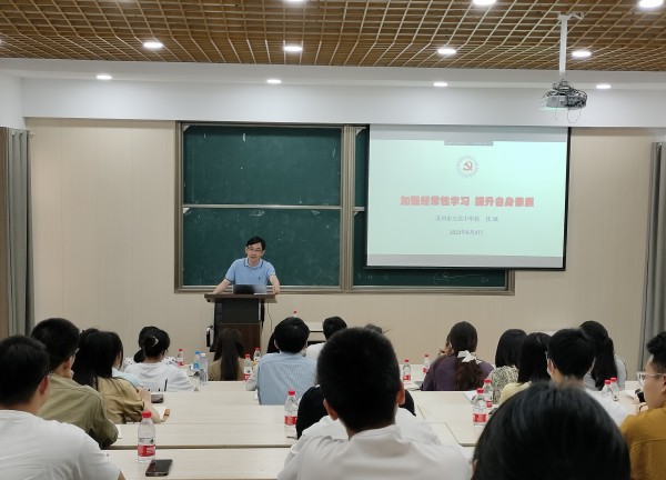 开班典礼结束后,苏州市立达中学党委副书记沈斌作了题为《加强经常性学习 提升自身素质》的专题讲座,他从“本领恐慌”这个概念入手,从“完成规定的学习任务”、“了解常见的学习形式”、“树立正确的学习理念”、“掌握有效的学习载体”四个方面系统阐述了如何加强经常性学习,更好地提升自身素质,如何依靠学习走向未来。
