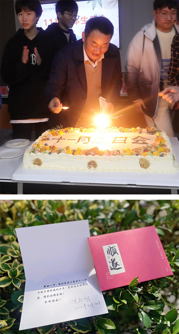 座谈会特别邀请了当天生日的同学参加,钟校长带领大家一起唱响生日歌、共切生日蛋糕,并送上亲笔书写的贺卡及代表“坚强向上,追求完美”寓意的铁兰花作为礼物。收到生日惊喜的同学们纷纷表示:“在大学的第一个生日竟然是和校长一起过的,真是太暖心了!”