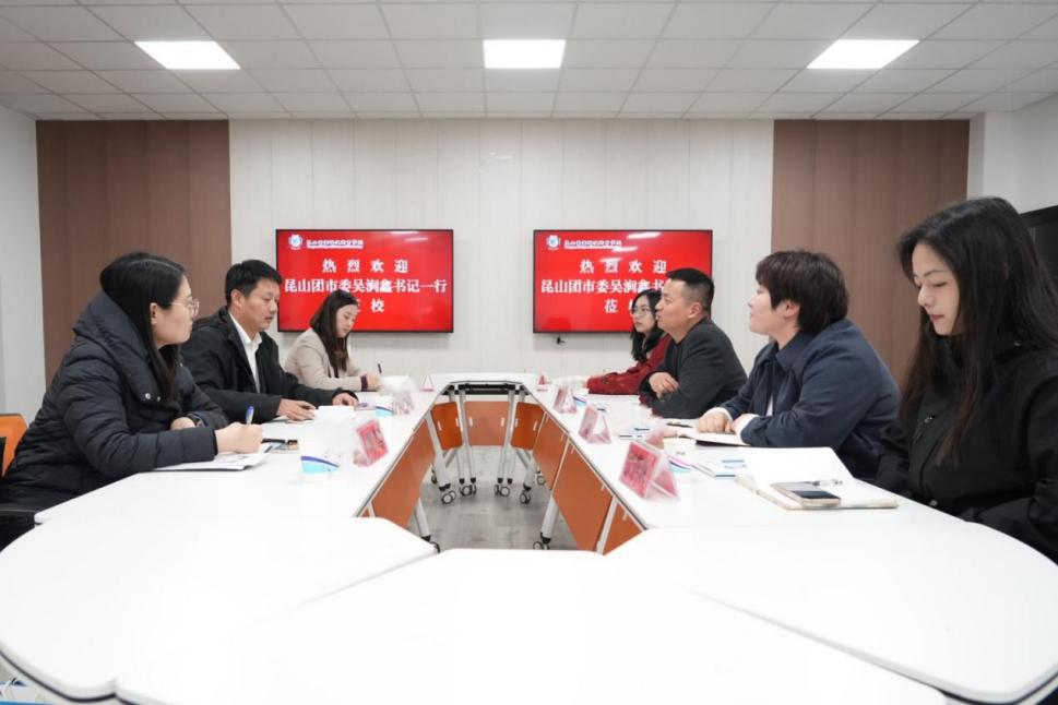 12月13日下午,昆山团市委书记吴涧鑫、副书记管文茜一行莅校开展共青团调研工作。beat365党委书记马长世、校长助理苏琼瑶热情接待,团委书记侯延华及相关人员参加调研座谈。