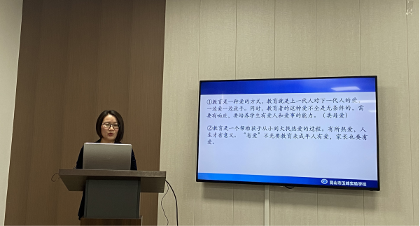 会上,朱小敏校长结合自身教育工作、发展经历,以“教育是一种爱”为主题展开讲座。她分享了自己第一个十年“爱上了学生”,第二个十年“理解了教育”,第三个十年“做一个有情怀的教育工作者,生活才有意义”的经历和经验。她认为,教育是上一代人对下一代人的爱,要一边爱一边放手,同时要培养学生有爱人和爱事的能力。每个教育工作者不仅是教育知识的“消费者”,更得是研究者、创造者和合理化建议者。
