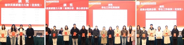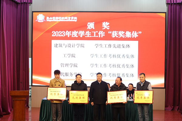 与会领导为2023年度学生工作先进集体、学生工作考核优秀集体、优秀学生工作者、辅导员素质能力大赛、学生工作优秀案例、优秀示范班会课获奖者颁奖。(撰稿/王霞,审核/苏琼瑶、刘咏芳)