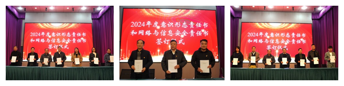 大会最后,马长世书记和钟名湖校长与各党总支、二级教学单位、党群部门、行政部门代表签订了2024年度意识形态责任书和信息安全责任书。(撰稿/孙馨月,审核/刘咏芳)