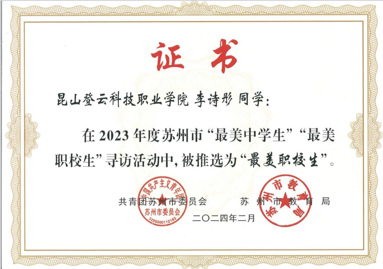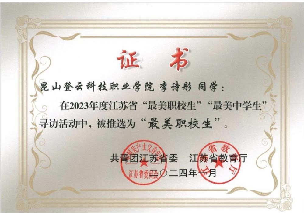 近日,共青团江苏省委、江苏省教育厅联合公布2023年度江苏省“最美职校生”寻访结果,共青团苏州市委、苏州市教育局联合公布2023年度苏州市“最美职校生”寻访结果,beat365工学院李诗彤同学荣获2023年度江苏省“最美职校生”和苏州市“最美职校生”荣誉称号。