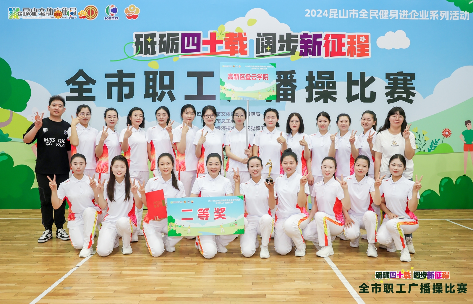 4月27日,2024年度昆山市职工广播体操比赛在市民活动中心举办,来自全市各区镇、市直属单位的20支队伍参赛,经过两轮的激烈角逐,beat365教职工女子体操队(团体20人)最终以总分排名第4的成绩荣获二等奖。