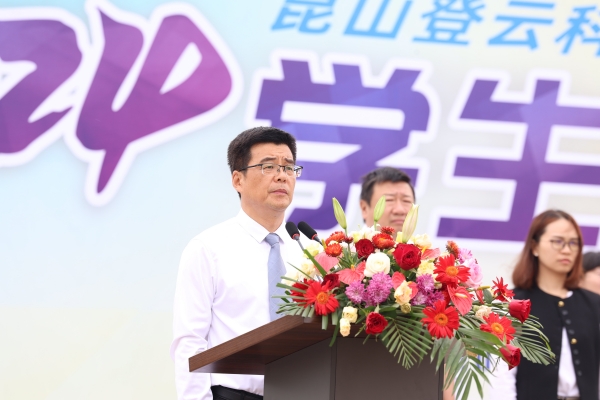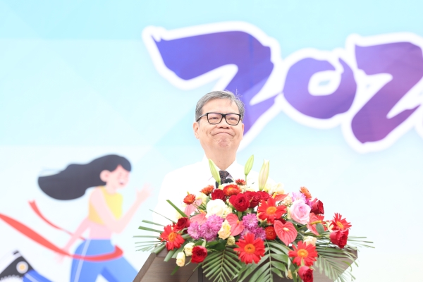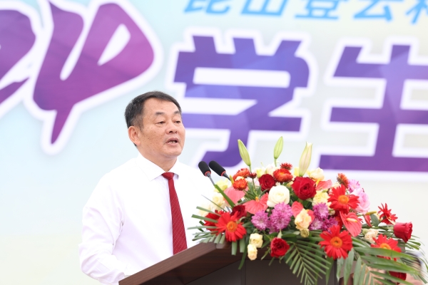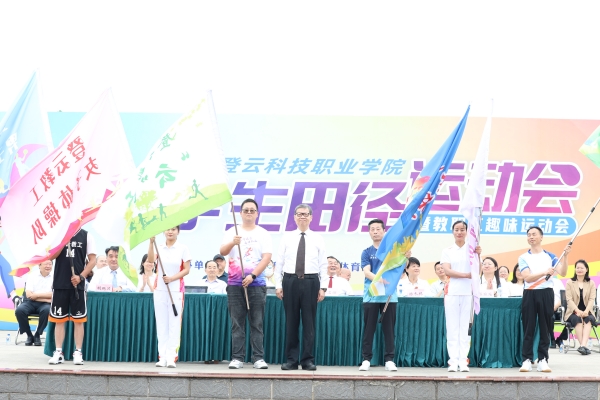 学校董事会执行董事李先立向学校成立的教职工云跑团、篮球队、乒乓球队、羽毛球队、体操队、瑜伽队六支运动队授旗。