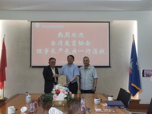 5月29日上午,台湾爱盲协会前理事长严长庚、特别顾问陈芷郁、副秘书长赖美杏、协会常务监事黄邦男,庆华机电技术顾问(昆山)有限公司副总赵庭等爱心人士来校交流,受到学校校长钟名湖、副校长陈长伟、校长助理胡鹏远等领导热情接待,产学合作与两岸交流处负责人参会交流。