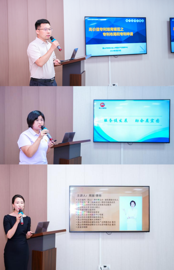 昆山开发区企业上市知识产权服务中心相关负责人谈俊、昆山人力资源市场集团有限公司配置事业群副总经理薛玲燕以及北京盈科(昆山)律师事务所股份高级合伙人周丽分别就知识产权、人才政策、劳动法等主题进行了精彩讲解,为与会嘉宾提供了丰富的专业知识和实用建议指导。