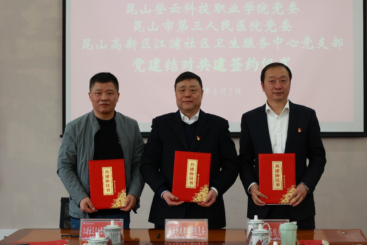 4 月 2 日下午,学校党委与昆山市第三人民医院党委、昆山高新区江浦社区卫生服务中心党支部在学校J2楼大会议室举行三方党建结对共建签约仪式。昆山高新区党群工作部副部长张振华、社会事业局副局长王怡,市第三人民医院党委书记吴伟、党委组织委员沈莉莉,江浦社区卫生服务中心党支部书记吴迎春,学校党委书记马长世、党委副书记副校长徐伟、党委委员副校长陈长伟、党委委员校长助理胡鹏远、党委委员校长助理苏琼瑶、党委委员朱翠芳出席会议,三方党建共建单位二级党组织负责人参加活动。