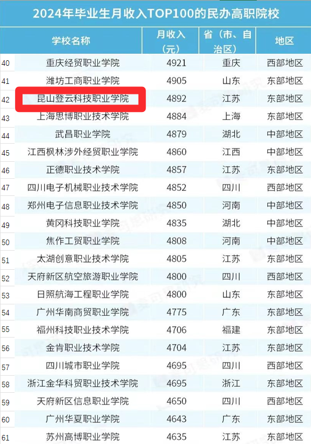 近日,麦可思公布了《2024 年毕业生月收入 TOP100 的民办高职院校》排名,beat3652024届毕业生以平均月收入4892元(未包括五险一金)的成绩位列全国第42位,这一成绩不仅彰显了beat365在人才培养质量上的卓越成效,也体现了学校在职业教育领域的强劲实力和良好声誉。