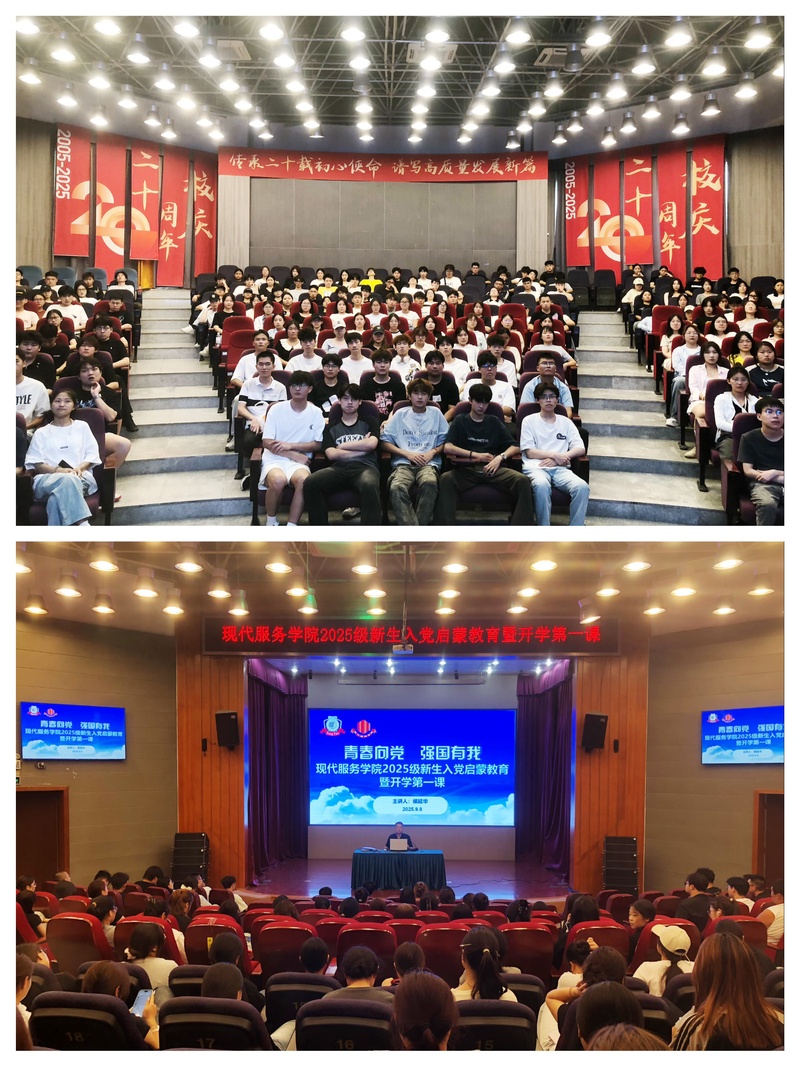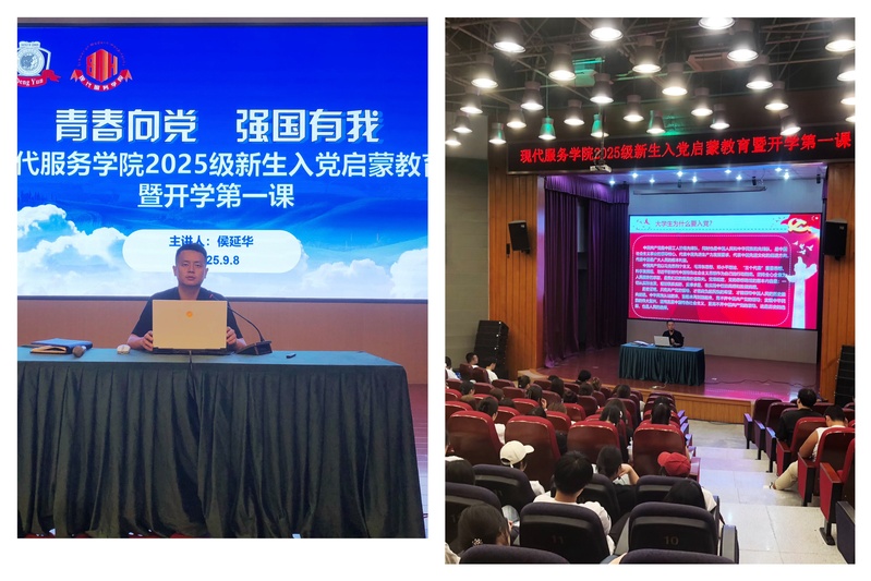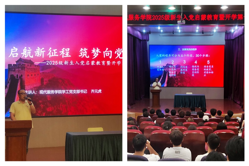 9月8日下午,现代服务学院2025级新生入党启蒙教育暨开学第一课在多功能报告厅隆重举行。本次教育旨在引导新生坚定理想信念、筑牢思想根基、明确奋斗目标,以昂扬姿态开启大学新征程。学院党政领导、新生辅导员和全体2025级新生共同参加。