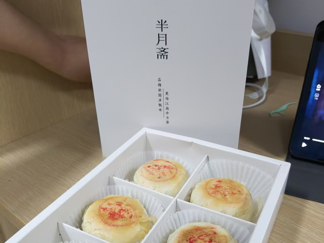 本次活动选用的月饼由张浦镇金华村与苏州老字号“半月斋”联袂打造,是“食尚张浦”品牌下的非遗匠心之作。月饼融合两项非遗技艺,以酥皮轻薄如羽、入口即化的苏点工艺为基底,内馅精选金华腊肉、黑猪肉与清脆笋丁,融汇出咸香适中、颗粒饱满的现代口感。肉香浓郁与笋丁爽脆交织,层次分明,丰润不腻,堪称传统技艺与现代风味的精彩对话。