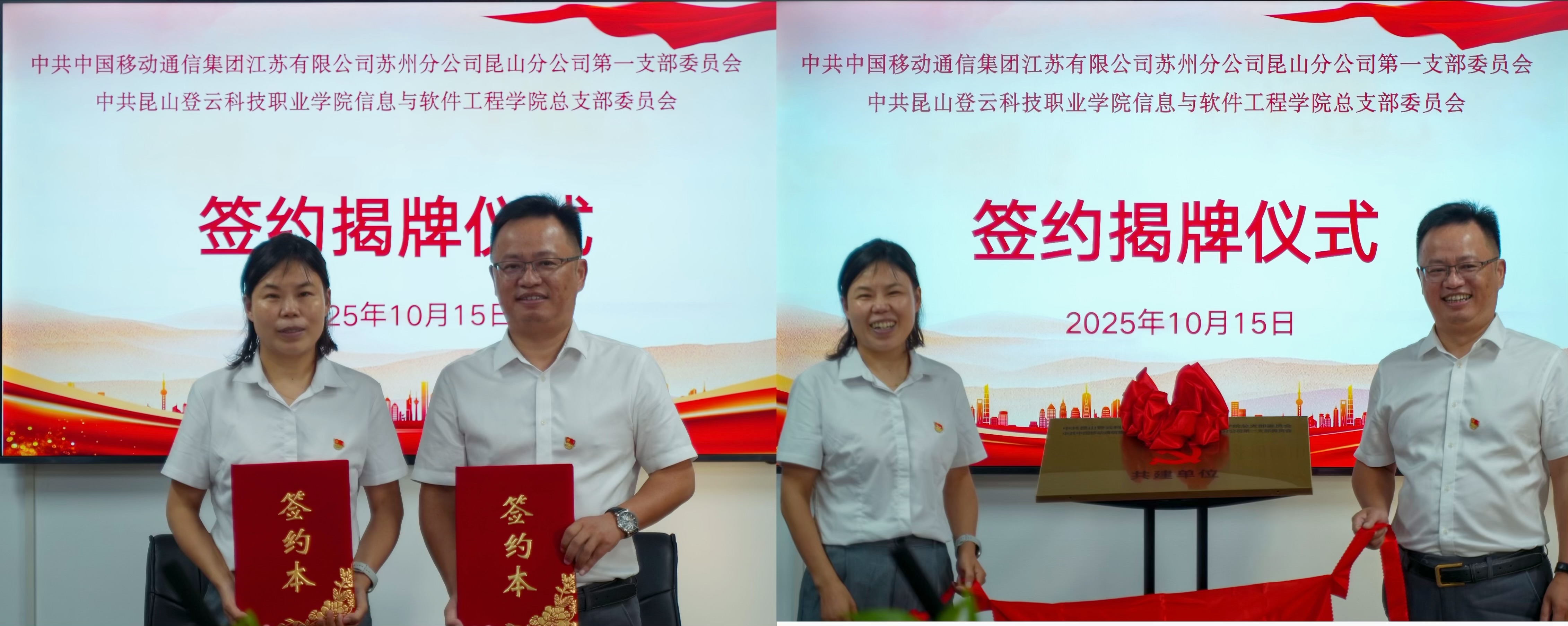 10月15日下午,信息与软件工程学院党总支与中国移动通信集团江苏有限公司苏州分公司昆山分公司第一支部委员会党建共建签约仪式在弘毅楼203会议室顺利举行。出席活动的领导嘉宾有中国移动昆山分公司党总支委员、一支部书记、副总经理孙明,亭林分局局长陈尚秋及代表;beat365会员官方网站党委委员、副校长陈长伟,信息与软件工程学院院长鲍建成(特邀嘉宾),信息与软件工程学院党总支副书记何玉勤。会议由何玉勤同志主持。