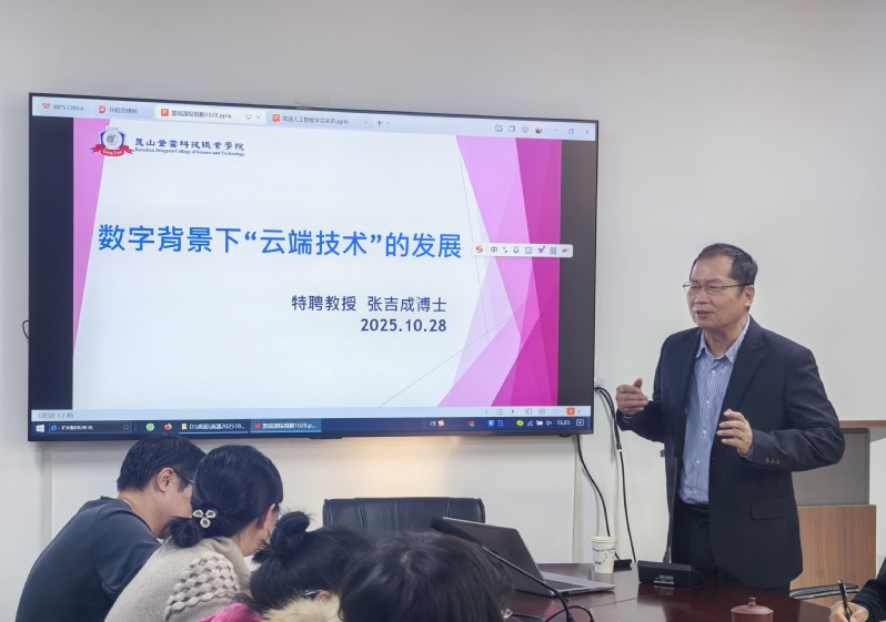 会上,张吉成教授以“数字背景下‘云端技术’的发展”为题,结合其在台湾地区推动云计算专业建设的经验,深入剖析了云端技术在医疗、制造、跨境服务等领域的应用实践,并系统介绍了云计算的关键技术及服务模式。同时,他针对学院课程规划提出构建“基础理论+实操技能+证书对接”三阶培养体系的具体建议,还建议教师提升专业能力,推动产教融合。