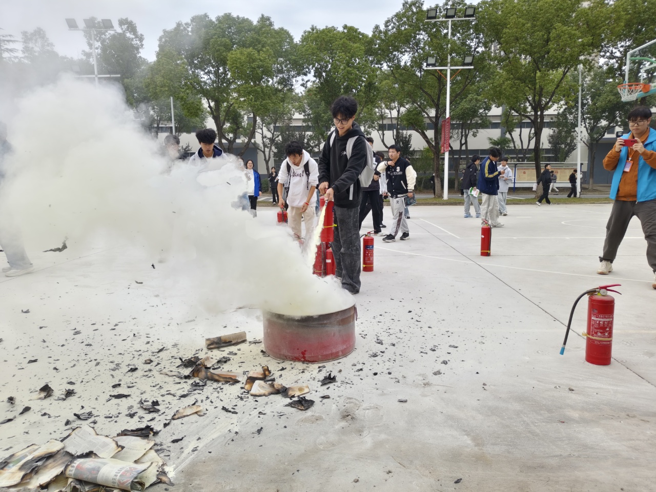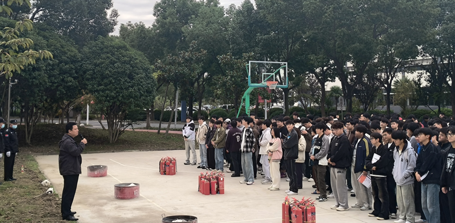 本次演练聚焦“实战化、全覆盖”,参与演练人员覆盖学院2025年新进教师及2024级,2025级学生。参演师生按预设疏散路线集结至篮球场,辅导员按要求完成人员清点核查。消防演练阶段,后勤保卫处老师开展消防灭火理论宣讲,指导师生完成干粉灭火器“提、拔、握、压”标准流程实操。部分师生参与灭火实战演练。学院明确要求参演人员以实战场景为标准,规范完成全流程处置。