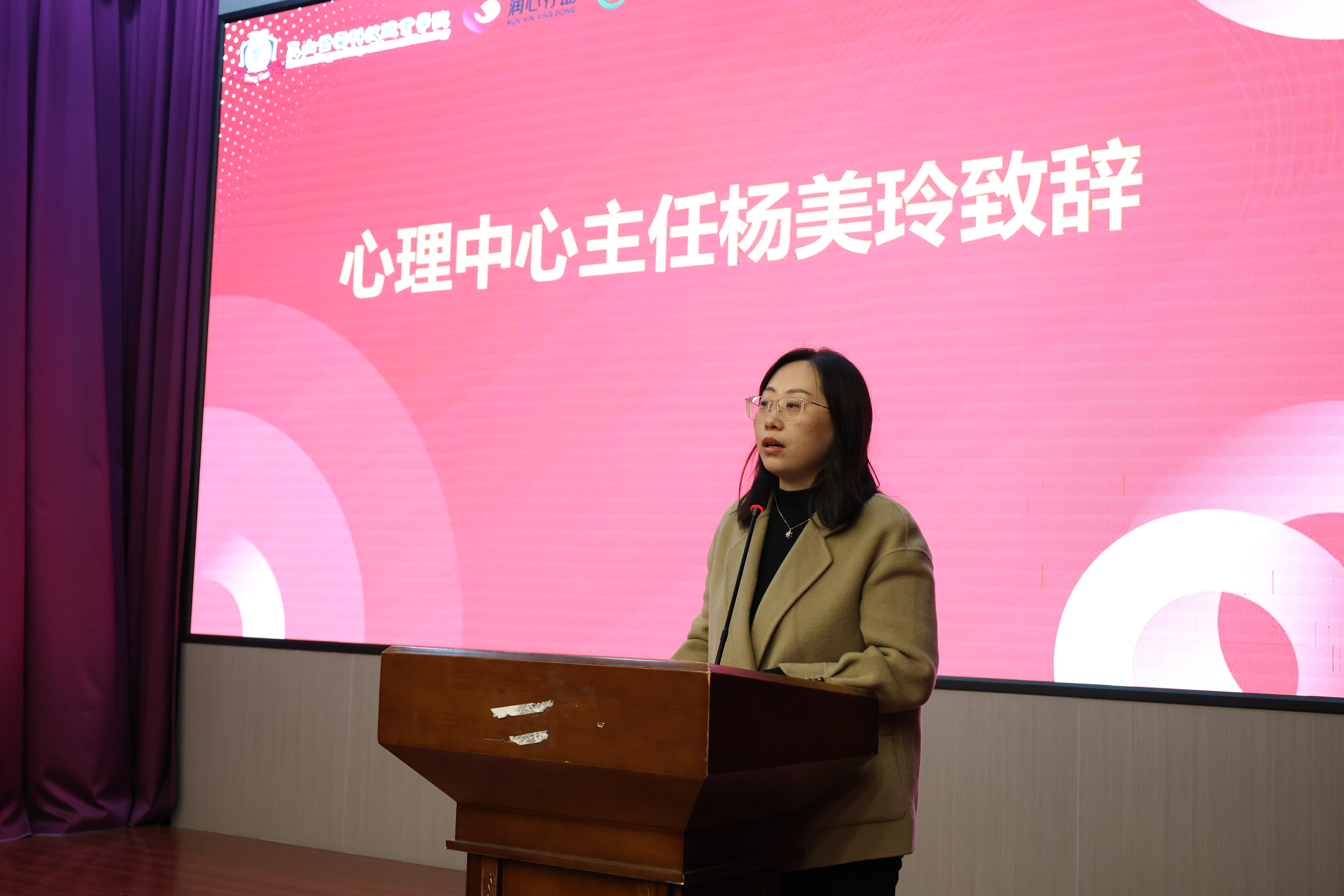 心理中心主任杨美玲在典礼上致辞。她指出,“心灵使者”是校园心理健康工作的重要力量,应怀揣"三颗心"履行使命:培养“敏锐的共情心”,保持“坚韧的平常心”,树立“智慧的界限心”,强调要用真诚陪伴和专业素养,共同筑牢校园心理支持防线。