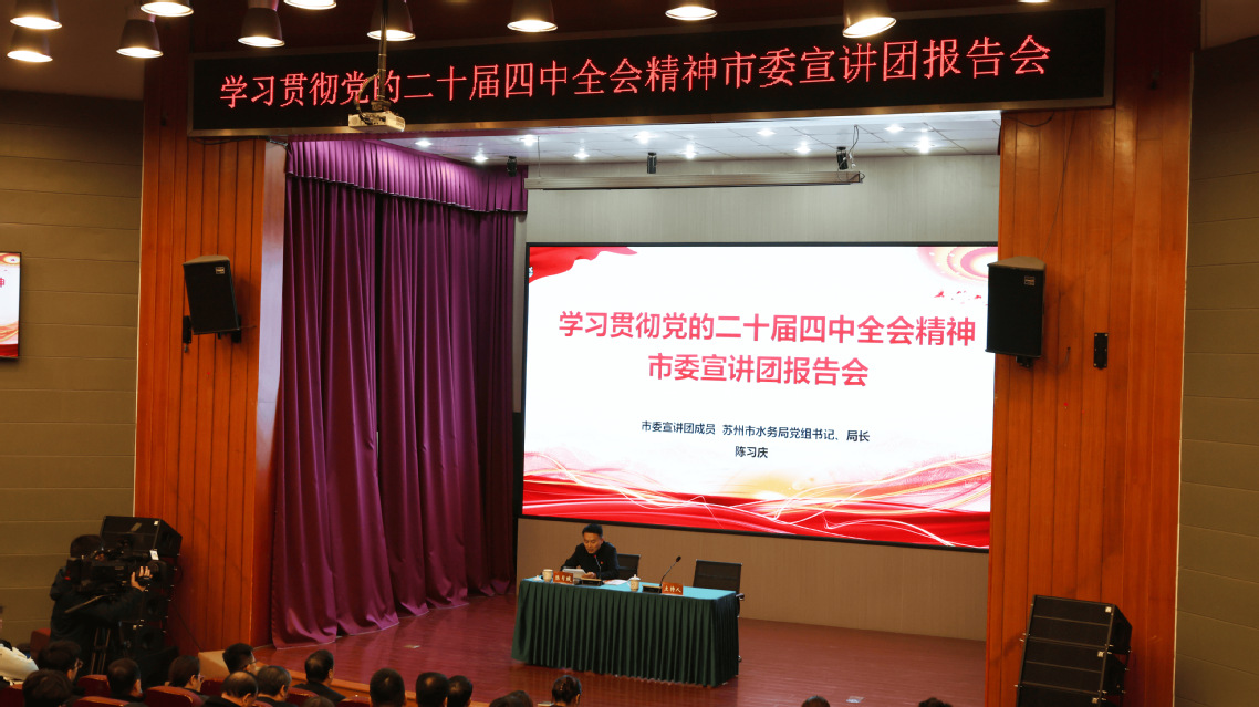 报告会上,陈习庆从全会的重大意义、“十四五”时期我国发展取得的重大成就与“十五五”时期国内外形势、“十五五”时期经济社会发展的指导思想、重大原则、主要目标、战略任务与重大举措、坚持和加强党的全面领导以及把学习贯彻全会精神同学习领会习近平新时代中国特色社会主义思想贯通起来等六个方面,紧密结合苏州发展实际和水务部门在保障水安全、保护水环境、改善水生态、优化水资源配置等方面的职责使命,对全会精神作了系统深入地阐释。