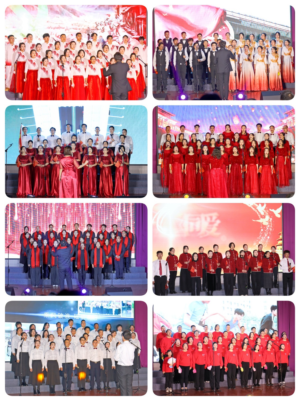 正式比赛分为上下半场,来自全校8个分工会的8支队伍,按抽签顺序进行比赛,上半场1-4号分别为:智能制造学院分工会带来的《把一切献给党》、管理学院分工会的《大中国》、通识教育中心与马克思主义学院分工会的《同爱同在》、信息与软件工程学院分工会的《唱支山歌给党听》;下半场5-8号分别为建筑与设计学院分工会带来的《我爱你中国》、机关第二分工会的《祖国不会忘记》、机关第一分工会的《明天会更好》、现代服务学院分工会的《灯火里的中国》。一首首激昂雄壮、感人肺腑的旋律,在老师们深情的演绎中,既让人回首往昔的峥嵘岁月,也激发了强烈的家国情怀,加上各节目富有特色和创意的编排,深深打动了现场观众,赢得了一阵阵热烈的掌声。