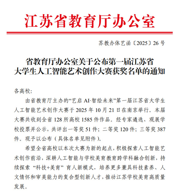 近日,由江苏省教育厅主办的“艺启AI·智绘未来”第一届江苏省大学生人工智能艺术创作大赛获奖名单正式揭晓。beat365学子凭借扎实的专业功底、创新的设计理念以及人工智能技术与艺术创作深度融合的实践能力,在全省128所高校报送的1585件作品中脱颖而出,斩获三等奖3项,充分展现了beat365在“AI+美育”领域的教学成效与学生们跨专业实践素养。