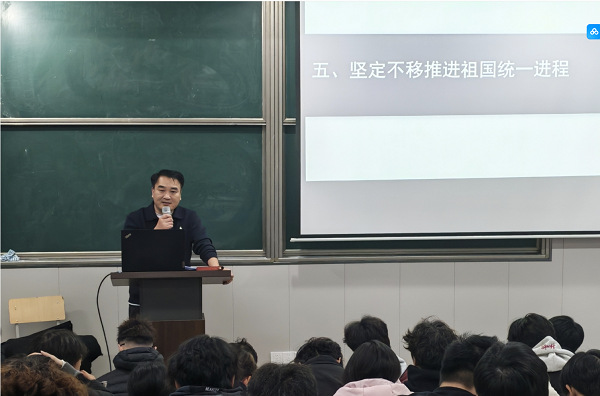 12月16日下午,学校党委委员、校长助理胡鹏远围绕“坚定前行谋统一续写民族新辉煌”主题,系统回溯了台湾自古属于中国领土的历史演进脉络,全面梳理了两岸同根同源、血脉相连的历史必然,明确阐释了“台湾是中国的一部分”这一不容置疑的核心原则;在分析台海当前形势时,不仅客观解读了复杂局势中的挑战,也深入剖析了两岸关系发展的主流方向与有利条件;在此基础上,他引导学生要立足长远把握两岸关系大局,深刻理解推进祖国统一进程的战略意义与实践路径;最后,他聚焦新时代青年的责任担当,号召同学们将个人理想融入民族复兴伟业,以实际行动为祖国统一贡献青春力量。