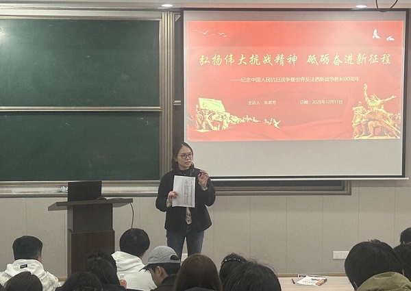 12月11日下午,学校党委委员、组织部(统战部)部长朱翠芳以“弘扬伟大抗战精神 砥砺奋进新征程”为题,围绕“什么是世界反法西斯战争”“世界反法西斯战争对相关国家的影响”“中国战场为什么是世界反法西斯的东方助战场”“为什么中国人民抗日战争深刻影响了世界反法西斯战争胜利的进程”“中国抗战精神是什么”等问题,详细介绍了近日中日关系日趋紧张的原因、“一二·九”主题团日活动的由来、南京大屠杀死难者国家公祭日、九三阅兵等内容。最后,针对当前复杂的国际关系,她对同学们提出了两点希望:一要认清事实本质,站稳政治立场;二要理性看待复杂形势,提升辨析能力。