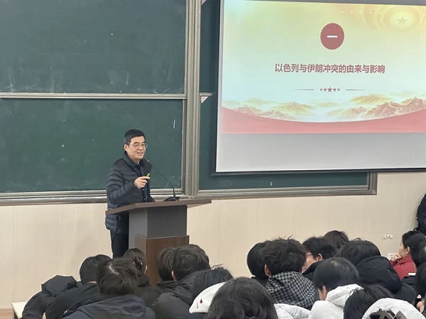 12月16日下午,学校党委副书记、副校长徐伟围绕“当前国际形势、大国关系以及中国的应对”,聚焦以色列与伊朗、俄罗斯与乌克兰等地区热点冲突,深入剖析了中国与印度、日本、菲律宾等周边国家的关系,通过数据的对比、生动的案例,客观分析了美国对华战略竞争带来的挑战,并引导同学们认识大国博弈的实质。他强调,中国有充足的战略定力、历史耐心与政策工具应对挑战、把握未来。他勉励同学们,要树立全面辩证的视野,既要看到风高浪急的国际环境,更要筑牢对中国发展的坚定自信,将爱国心、强国志转化为脚踏实地、学习成才的自觉行动,为未来参与国家建设夯实基础。