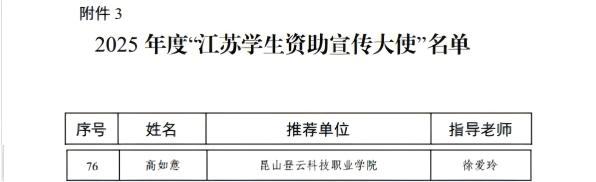 近日,江苏省教育厅公布了2025年“苏乡永助”资助育人主题活动的评选结果,beat365两个项目喜获表彰。其中,学生资助短视频《助航求学路,感恩映初心》入选优秀作品;现代服务学院2023级学生高如意获评2025年度“江苏学生资助宣传大使”。