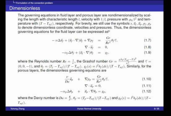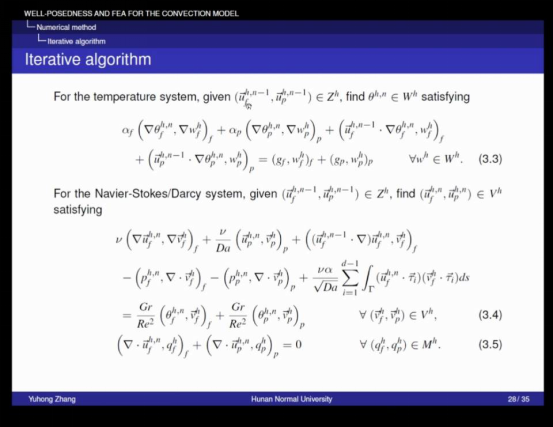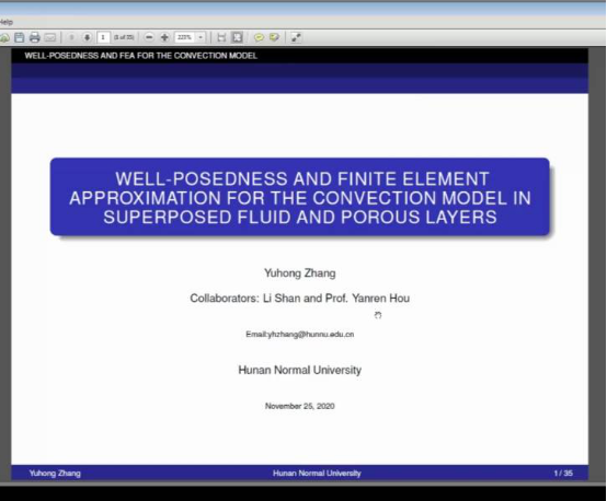and Porous Layers》。在本次报告中,张玉红老师通过构造原模型的摄动系统,得到了原模型的适定性,并提出了一种有效的有限元算法。该算法将模型分解为两个子问题,提高了计算效率。用能量估计法和归纳法证明了算法的稳定性,并给出了完全误差分析。最后,通过数值试验验证了理论结果。